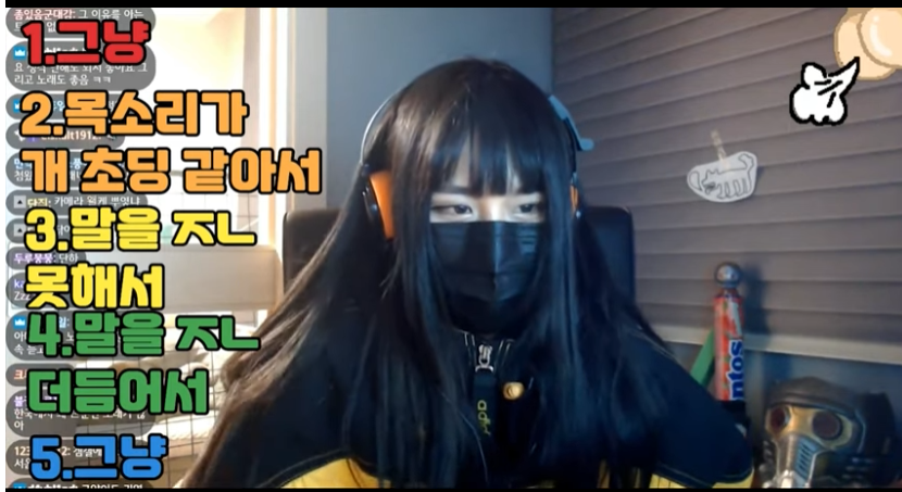 1. 그냥, 2. 목소리가 초딩같아서, 3. 말을 못해서, 4. 말을 더듬어서, 5. 그냥 이랍니다.
