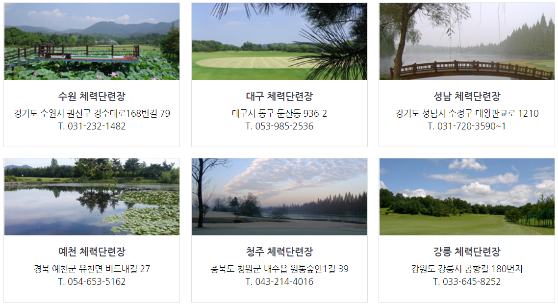 체력단련장은 공사 ,광주,사천,김해,원주,수원,대구,성남,예천,청주,강릉,충주,서산,오산 지역에 위치해 있습니다.